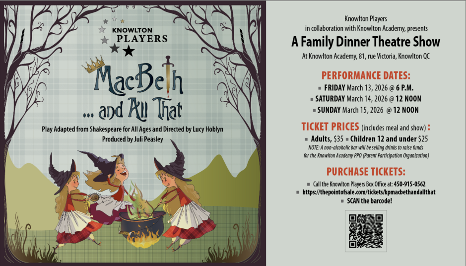 This collaborative production with Knowlton Academy will take place the weekend of March 13th at Knowlton Academy, 81 rue Victoria.